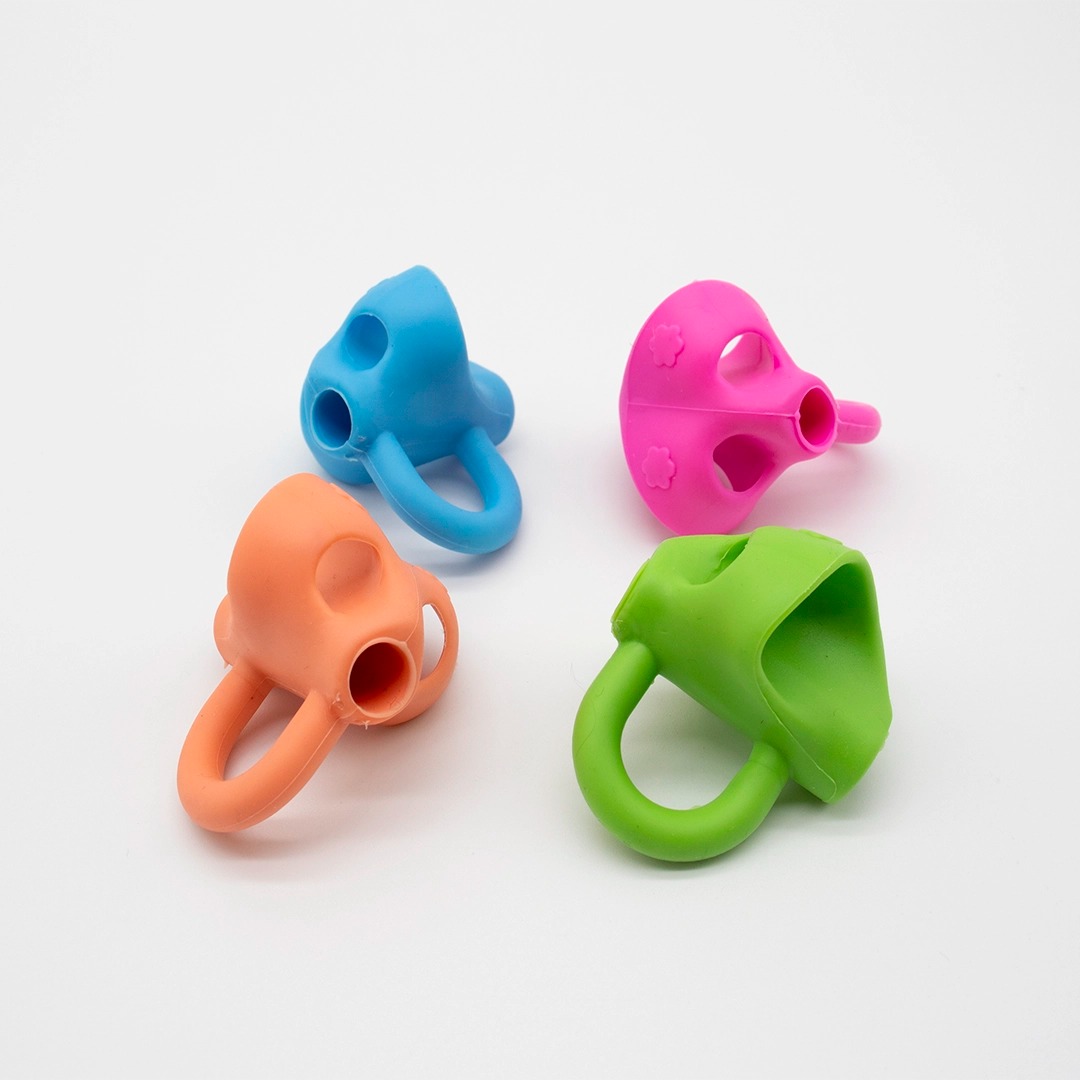 Fabricado em plástico flexível e atóxico, o adaptador de lápis para escrita é leve (apenas 5g), resistente e reutilizável. Seu formato anatômico possui cavidades que guiam o posicionamento correto dos dedos, ajudando no desenvolvimento da pegada funcional, além de estimular o uso lúdico com suas cores vibrantes: azul, verde, rosa e laranja.
