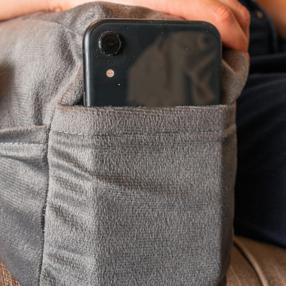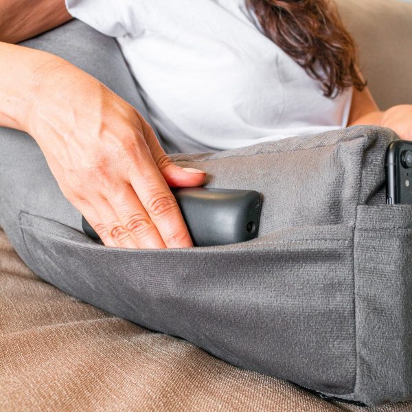 A almofada possui apoios de braço com 4 bolsos integrados para que você possa acomodar diversos objetos da forma que preferir, estando com eles sempre a mão e o mais importante, sem perder o conforto.
