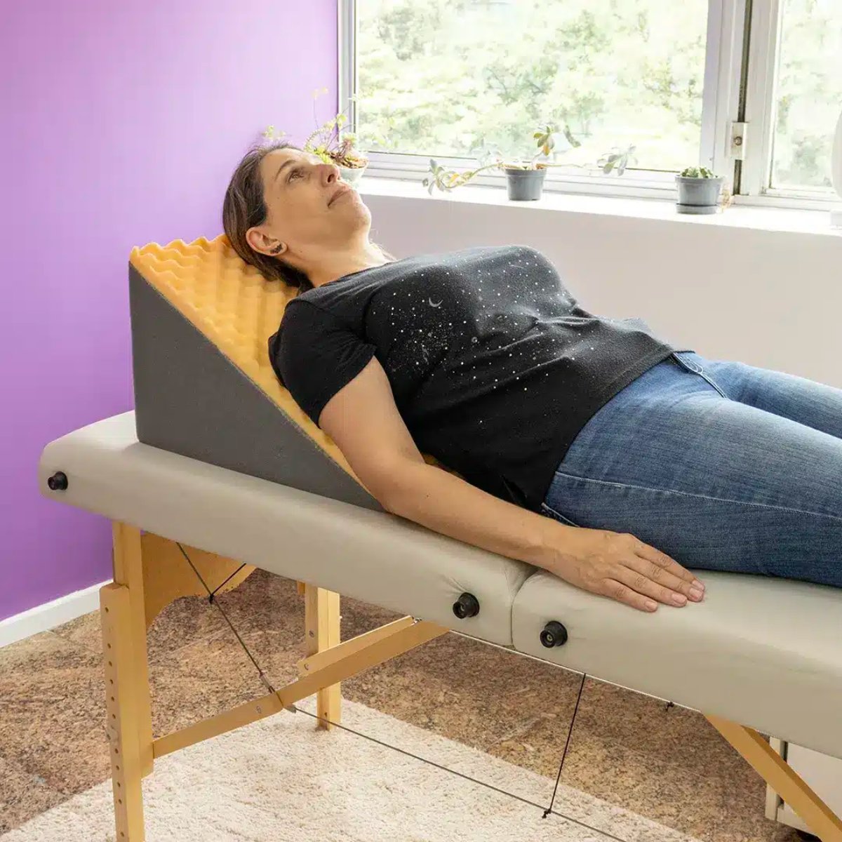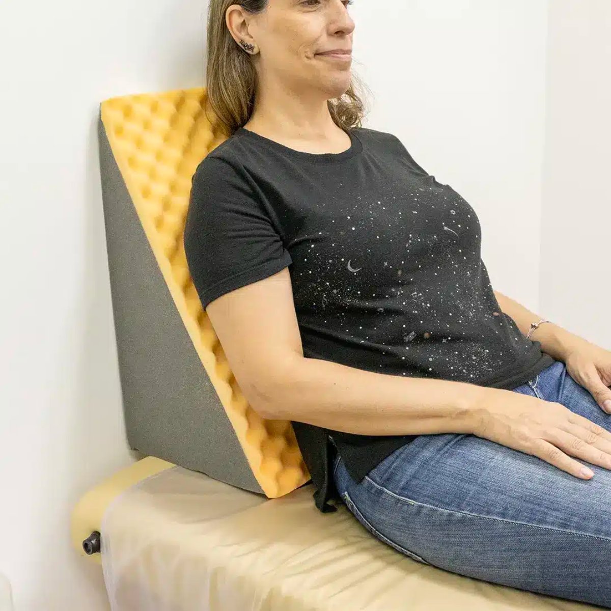 É uma almofada de encosto triangular perfilado feito em espuma de Poliuretano com perfilado, acompanha uma capa de suplex, oferece suporte, encosto, posicionamento, postura. Seu tamanho é ideal facilmente pode ser utilizado em sofá, cama, hospitais , clínicas e casas de repouso.
