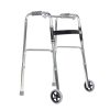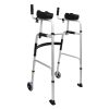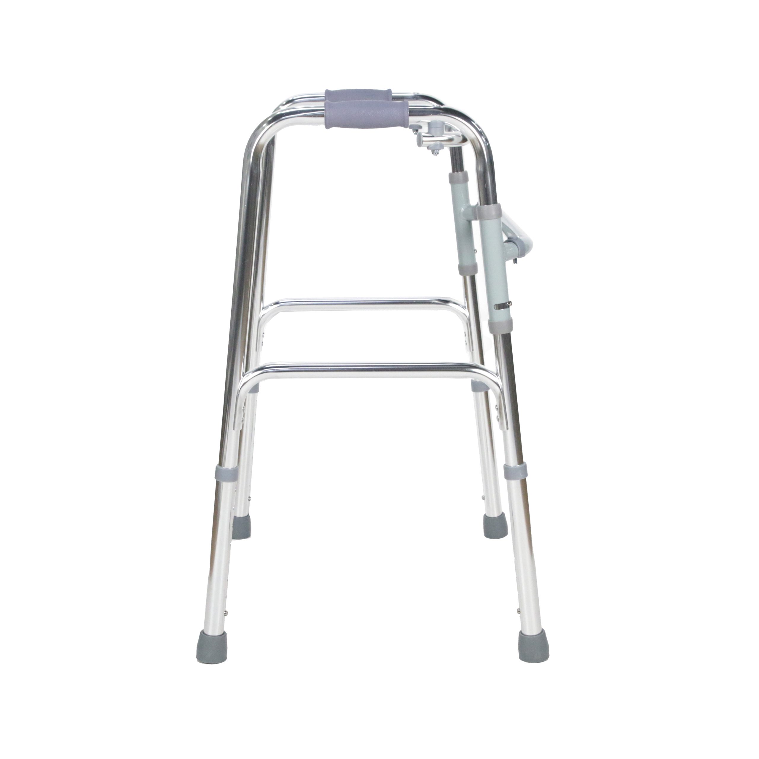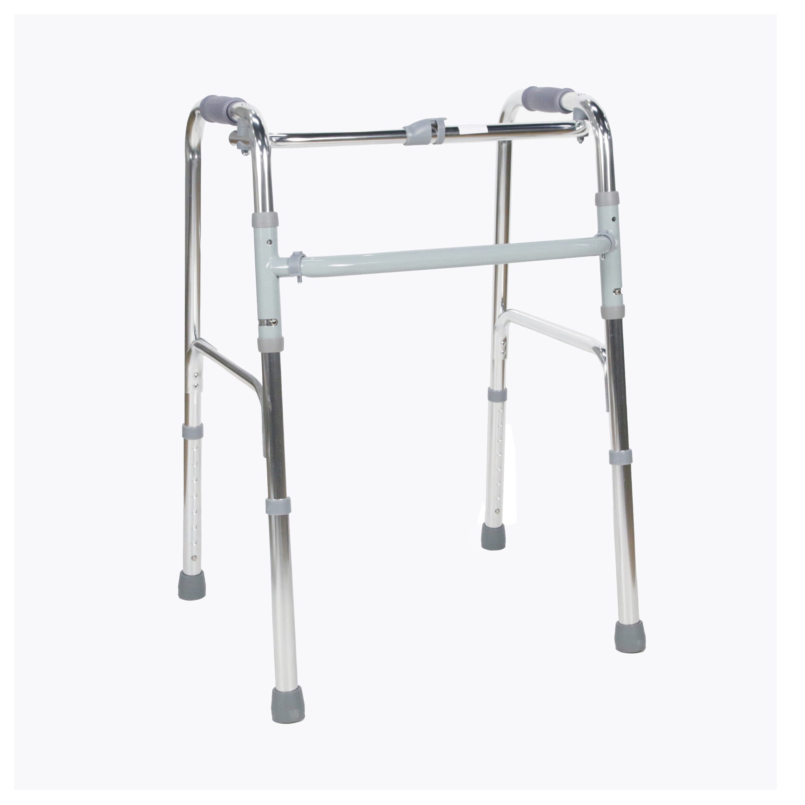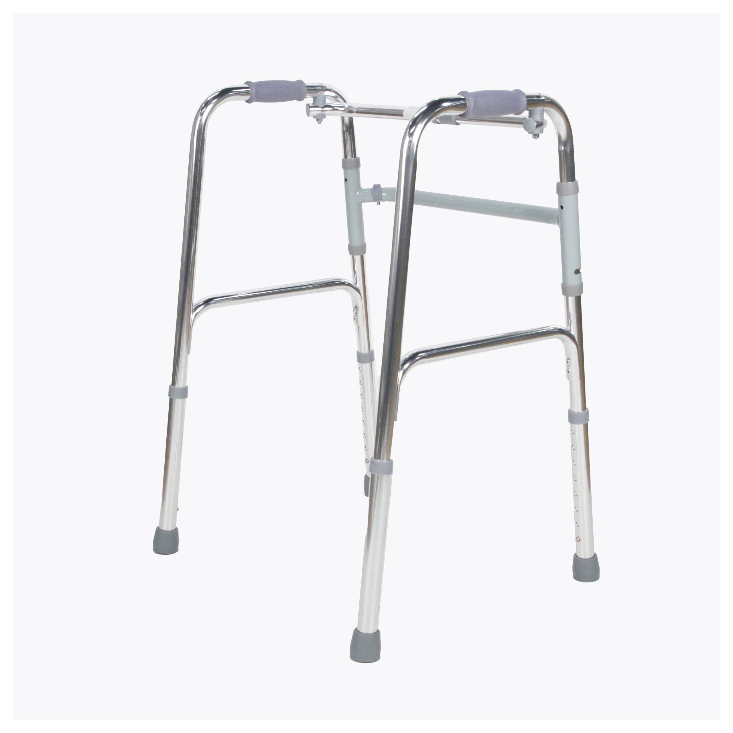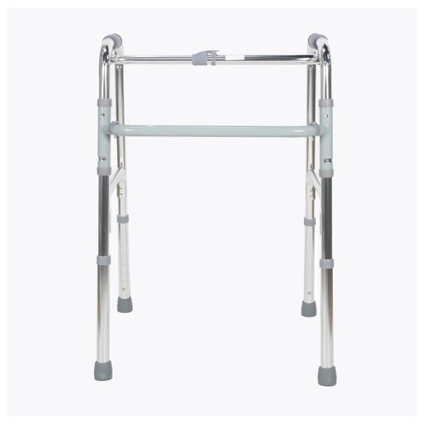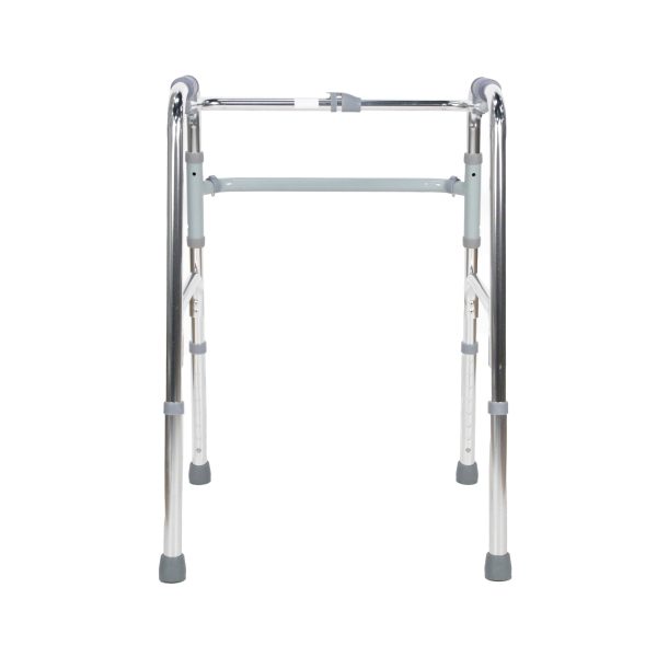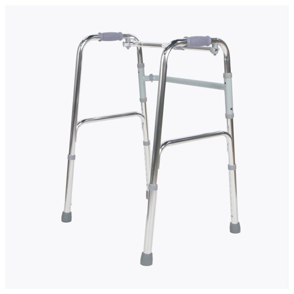 Posicione o andador à frente do corpo, ajustando a altura conforme a estatura do usuário. O sistema articulado permite que cada lado acompanhe o movimento natural da marcha, proporcionando mais estabilidade durante o deslocamento.