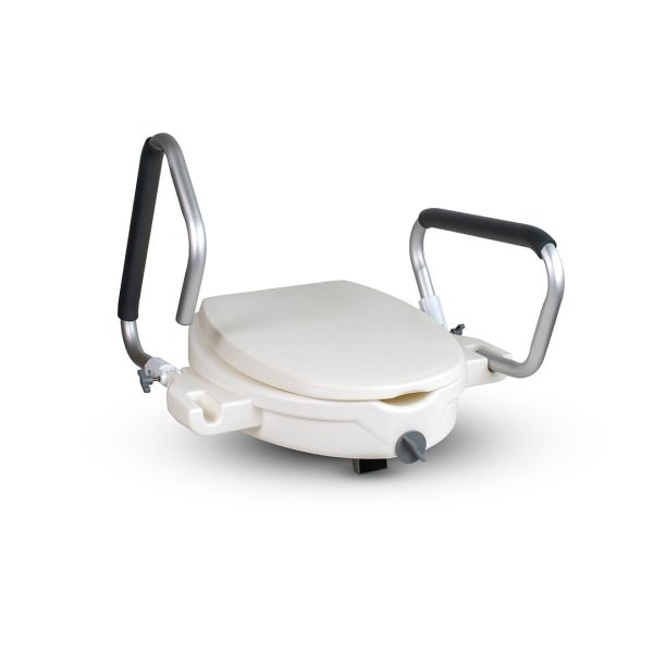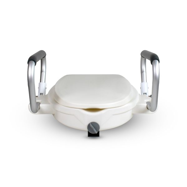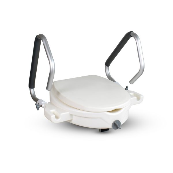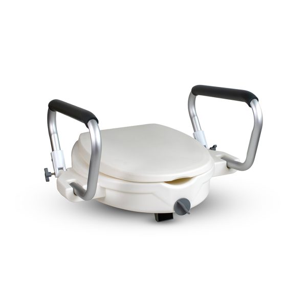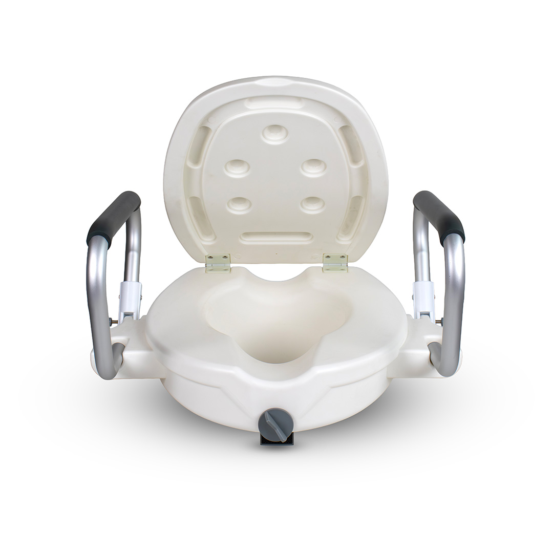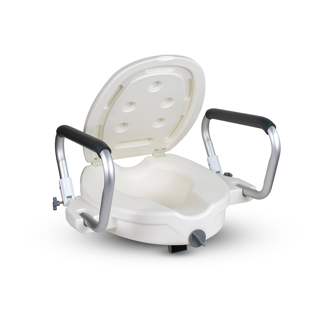 Posicione o assento sobre o vaso sanitário e ajuste as travas laterais até que fique firme. Utilize os apoios de braços para maior estabilidade ao sentar ou levantar. Os braços podem ser rebatidos individualmente para facilitar o acesso lateral.