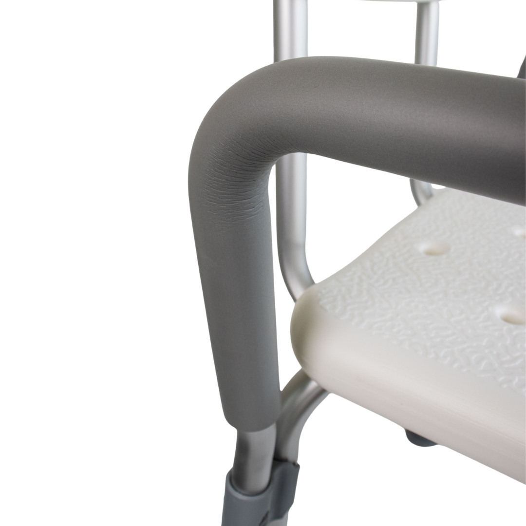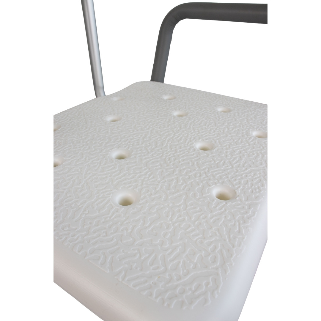 Seu assento e encosto são fabricados em polietileno de alta densidade (PEAD), garantindo conforto, fácil higienização e durabilidade. Já a estrutura em alumínio anodizado proporciona leveza sem comprometer a resistência. Os apoios de braço laterais com pegada anatômica oferecem mais estabilidade para sentar e levantar, enquanto os pés com ventosas antiderrapantes mantêm a banqueta firme no chão, mesmo durante o uso em ambientes molhados.