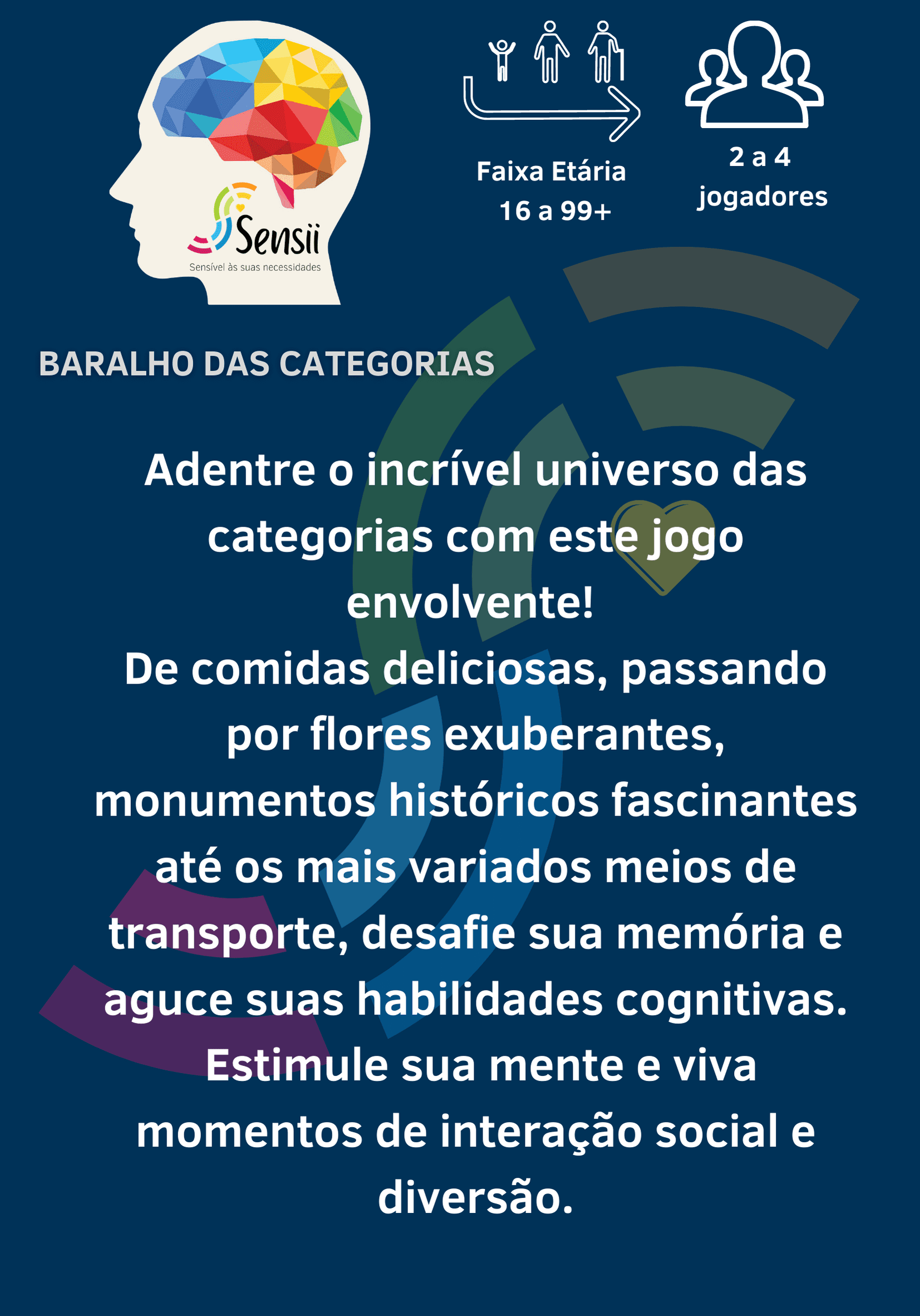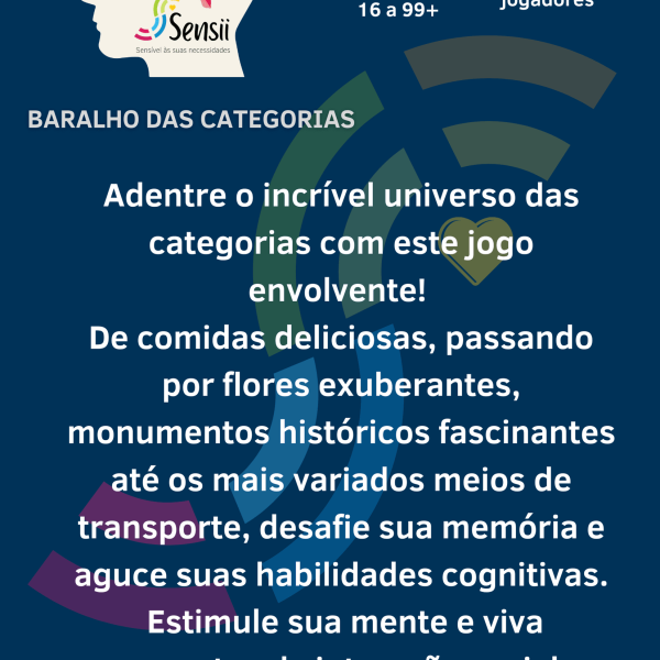 Criado pela Sensii, uma marca que visa melhorar a qualidade de vida através de jogos inovadores, o “Baralho das Categorias” é um recurso valioso e divertido para quem busca maneiras atraentes de manter a mente ativa e saudável. Explore o “Baralho das Categorias” e embarque em uma viagem de descoberta, aprendizado e diversão.