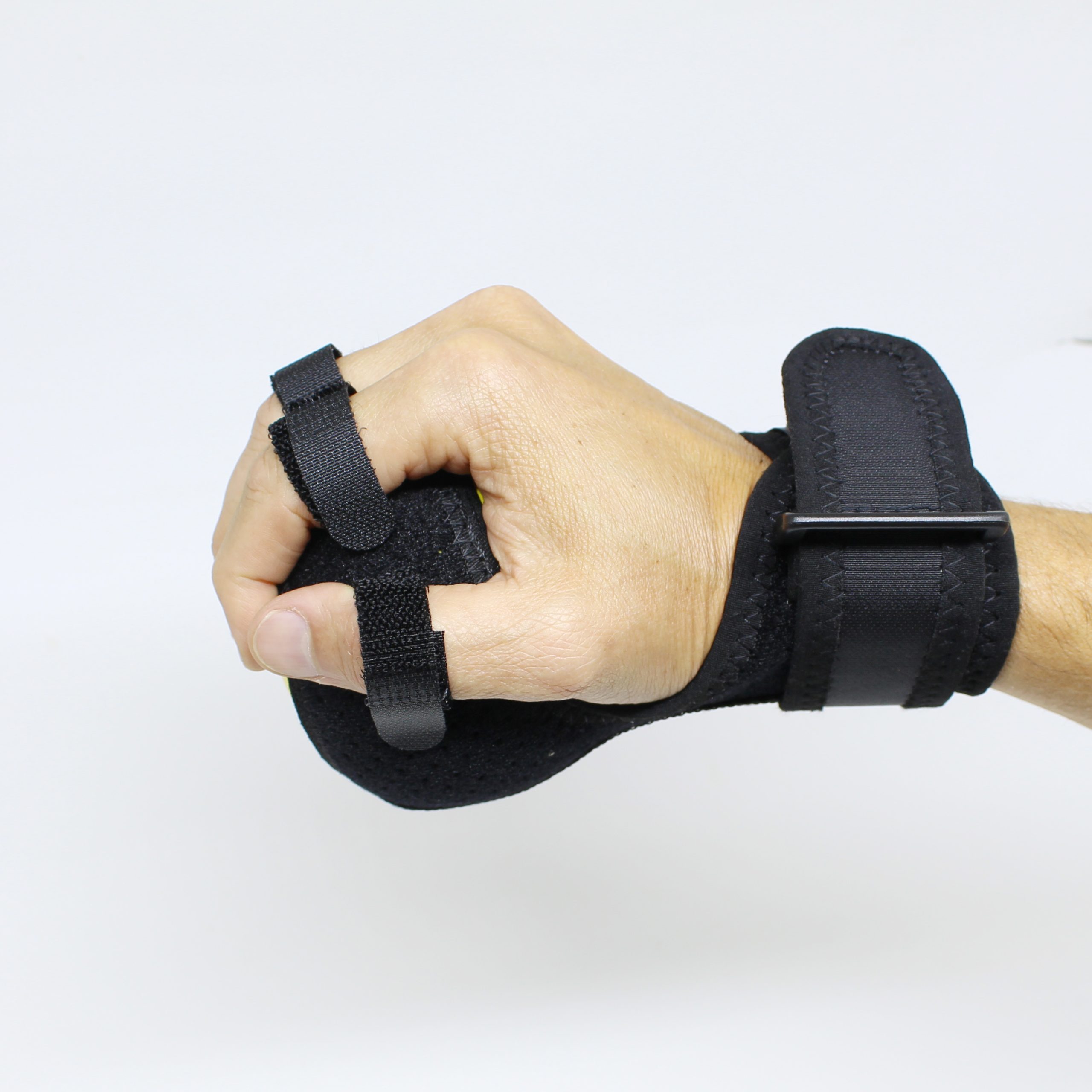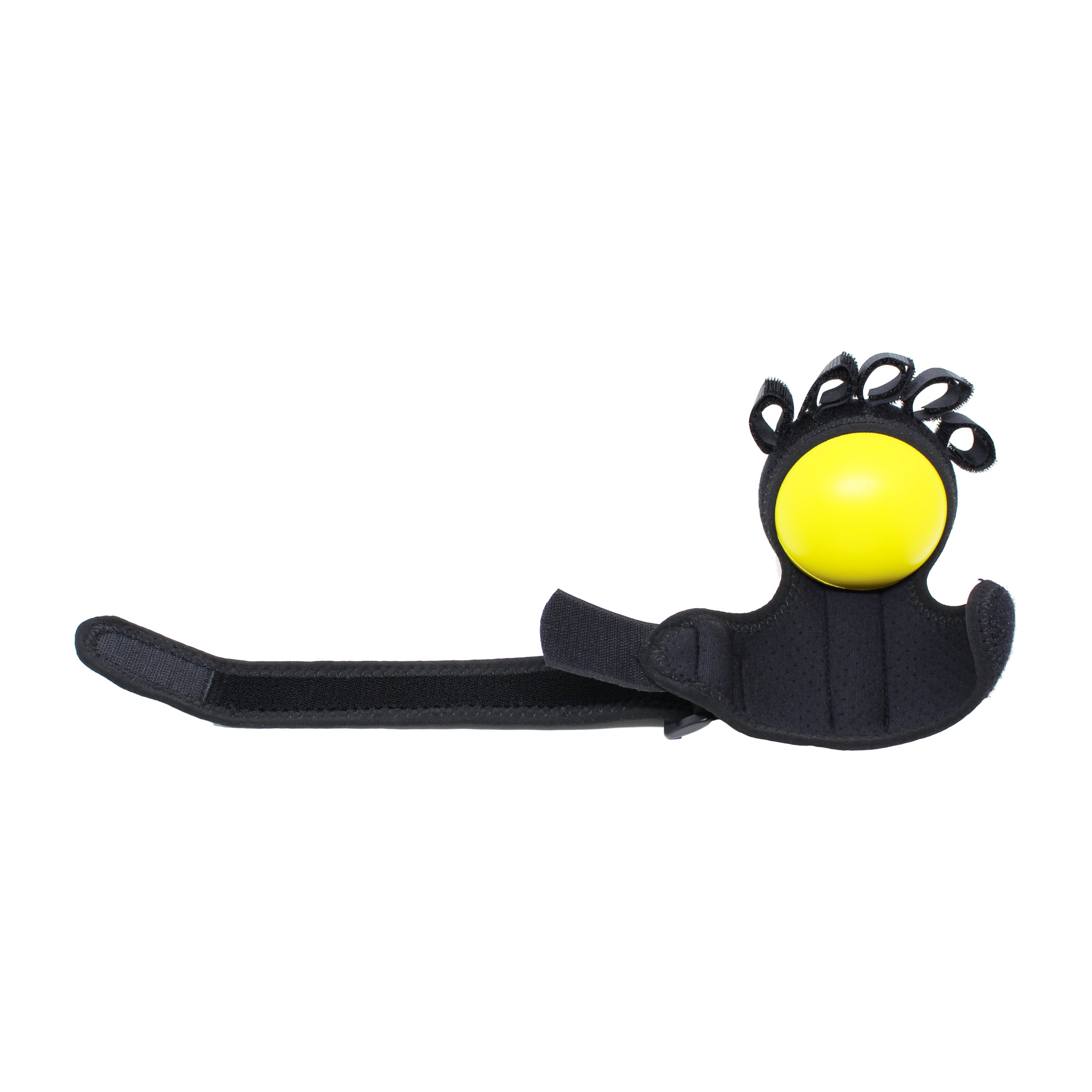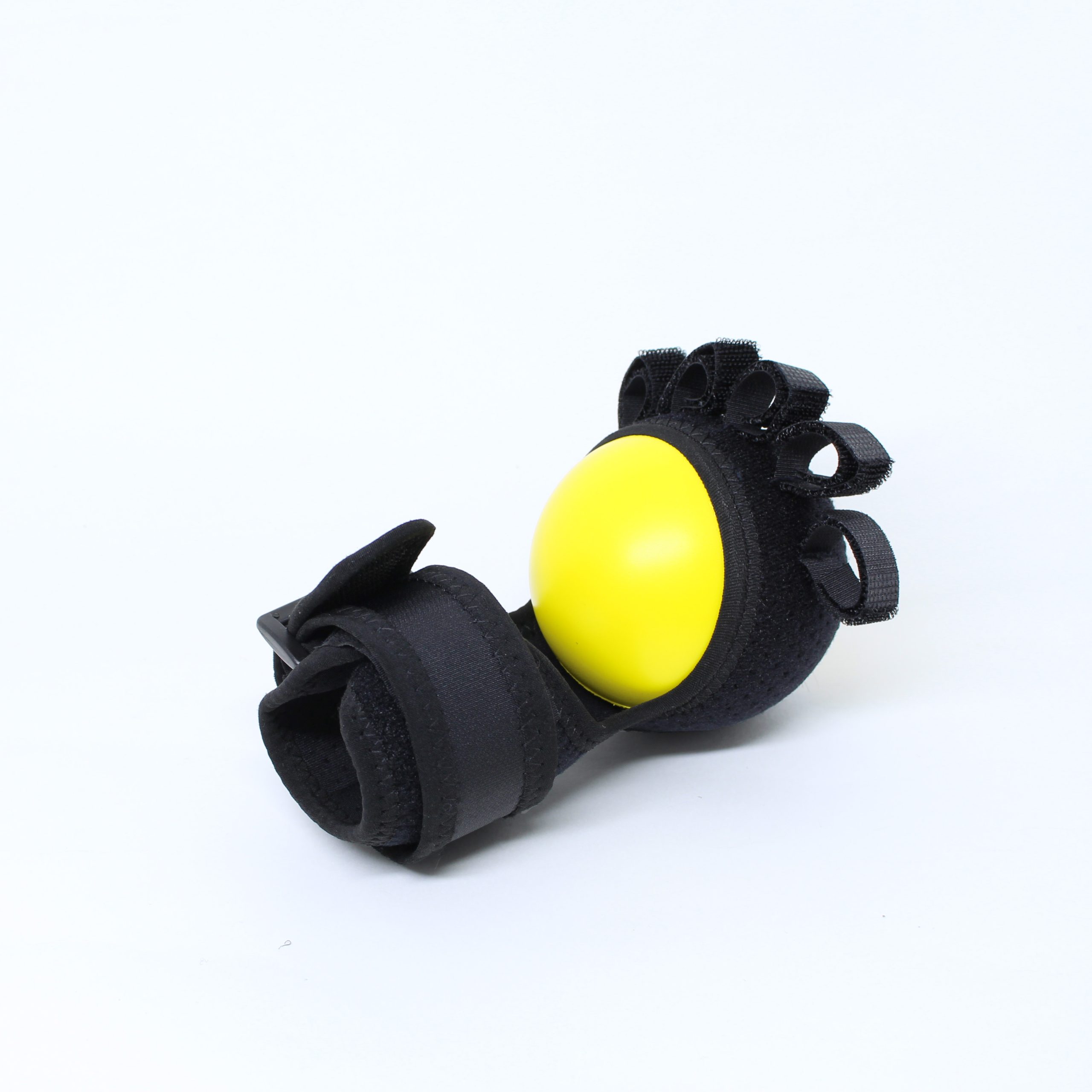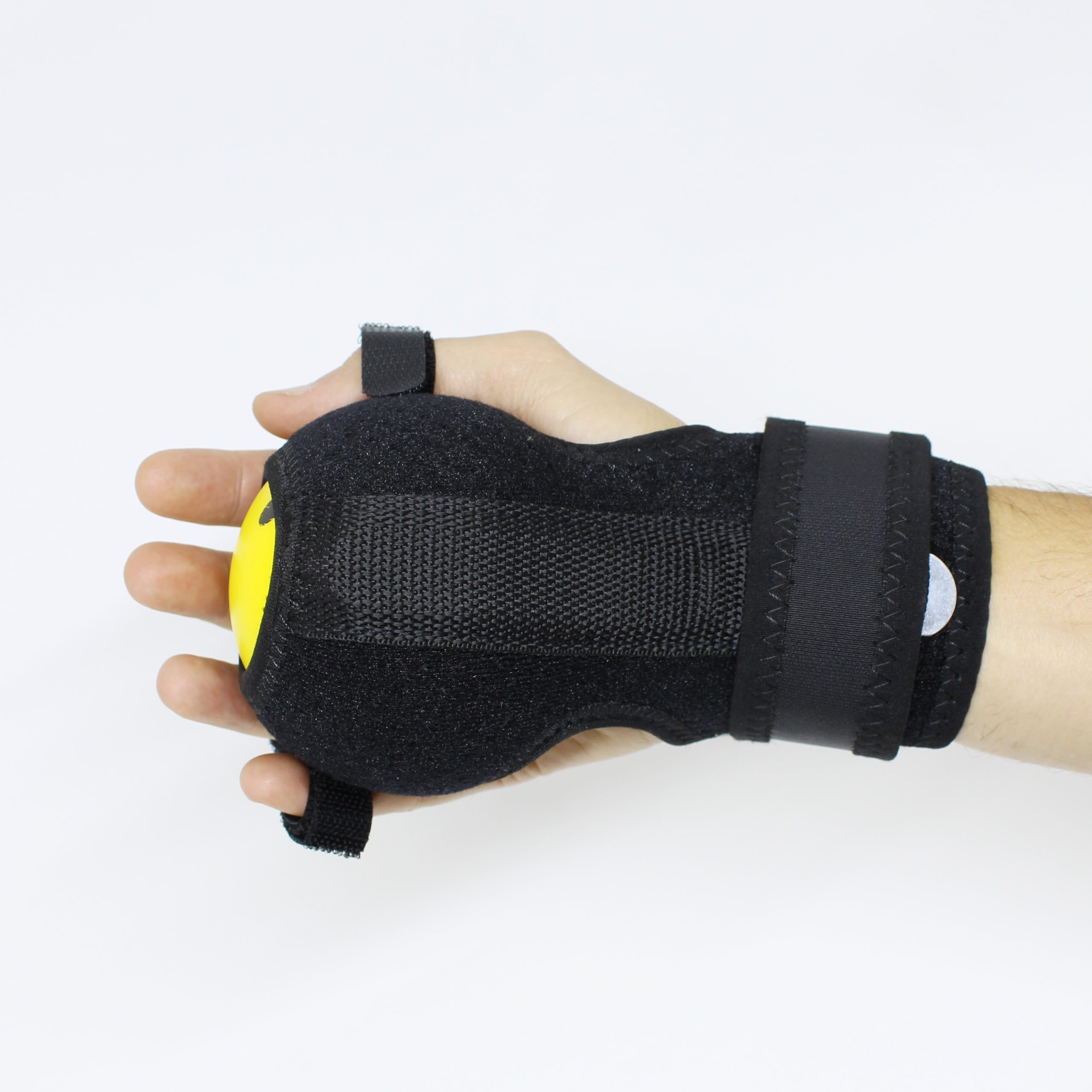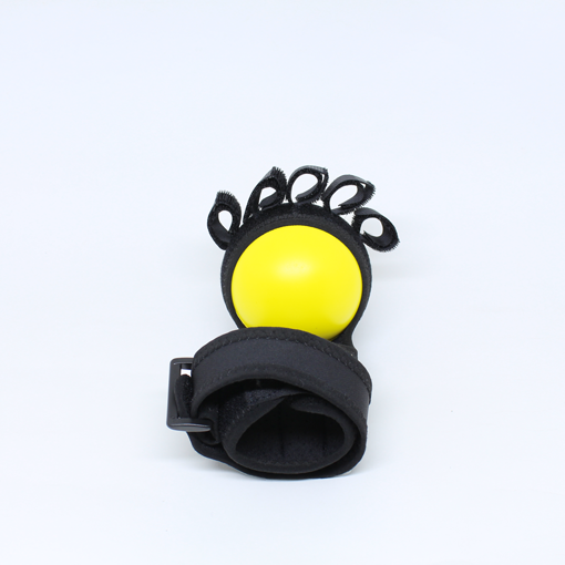 O produto é feito de fita de nylon, uma bola de espuma e uma haste de aço localizada que ajuda a estabilizar o punho em posição funcional na hora do exercício.