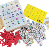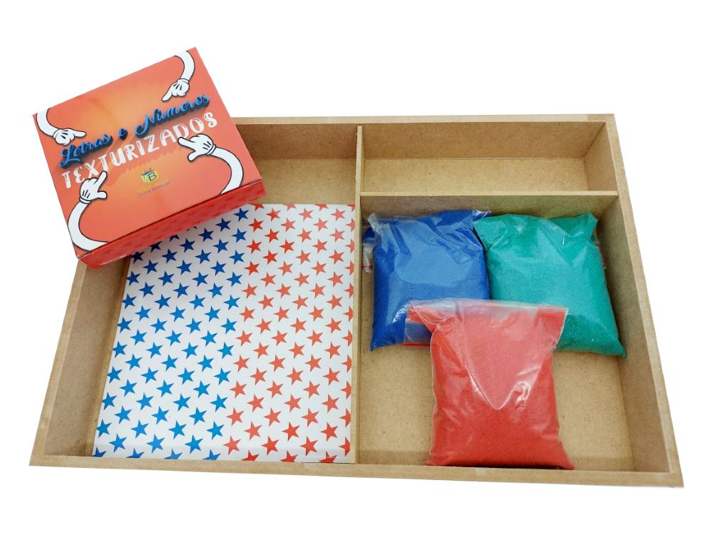 Contém: uma caixa demadeira com 3 divisões, 3 areias coloridas (vermelha, azul e verde) e uma caixa de letras e números texturizados.