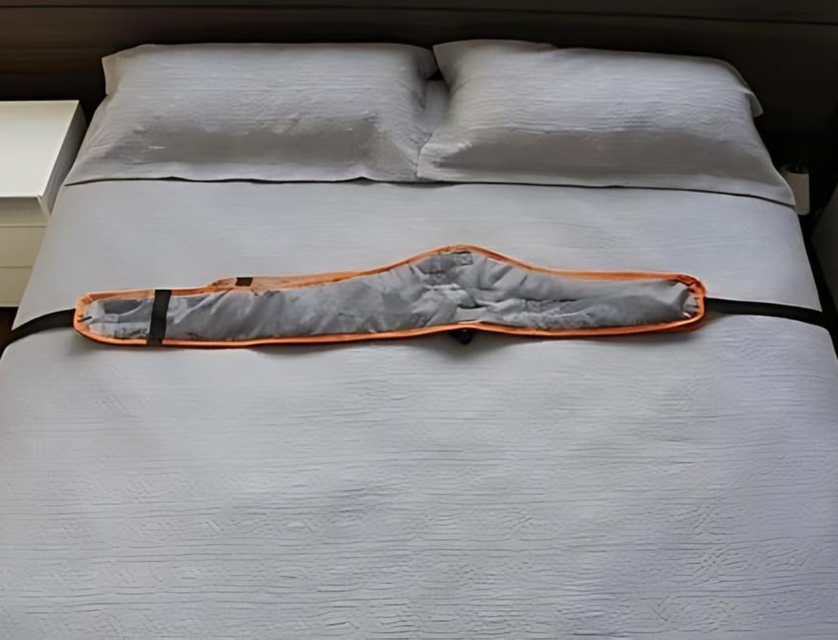 Coloque a cinta posicionada e presa no colchão ou na cama, deite o paciente por cima da cinta e prenda com as fitas nylon nas fivelas de metal. Ajuste com a tensão adequada.