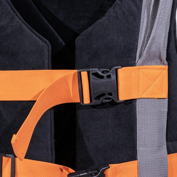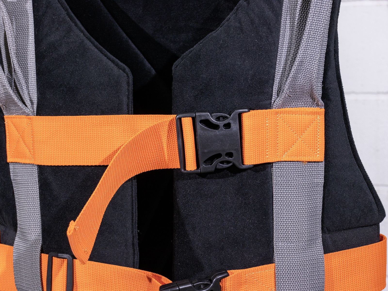 Cintos e fivelas duplas reforçadas com costura travetada para máxima resistência;