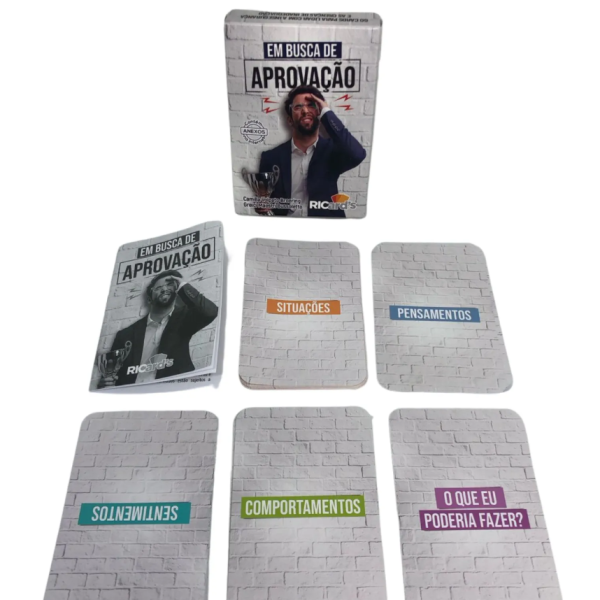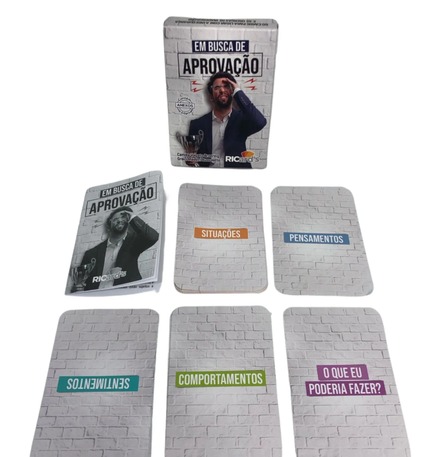 Os 60 cards do “Em Busca de Aprovação” são divididos em cinco grupos, cada um deles focado em um aspecto essencial da sua vida emocional e cognitiva. Os grupos de situações, pensamentos, sentimentos, comportamentos e ações possíveis foram criados para facilitar a identificação dos gatilhos que levam à insegurança e à necessidade de aprovação. Use este recurso em suas sessões de terapia ou em momentos de introspecção pessoal para promover uma mudança real e duradoura em sua vida.