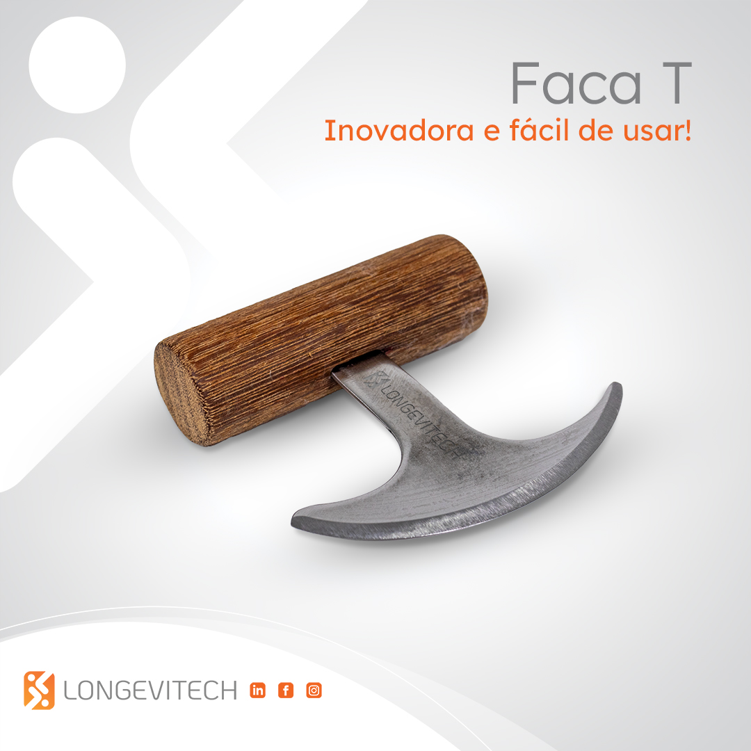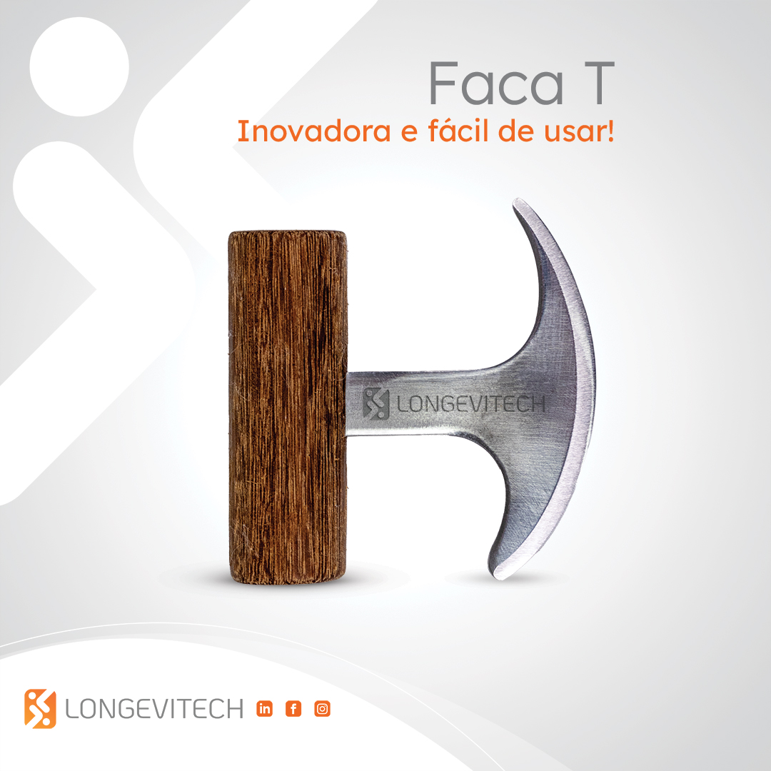 A Faca T é uma inovadora e fácil faca adaptável, projetada para cortar alimentos com um movimento de balanço. Sua exclusiva vantagem mecânica oferece uma solução eficiente para pessoas com pouca força nas mãos. Ao aplicar pressão diretamente acima do objeto a ser cortado, o usuário precisa de menos força e destreza para realizar o corte.