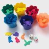 Um kit com 72 ursinhos divididos na cores azul, vermelho, verde, laranja, amarelo e roxo, 6 potinhos na mesma cor, 2 dados (cores e números).