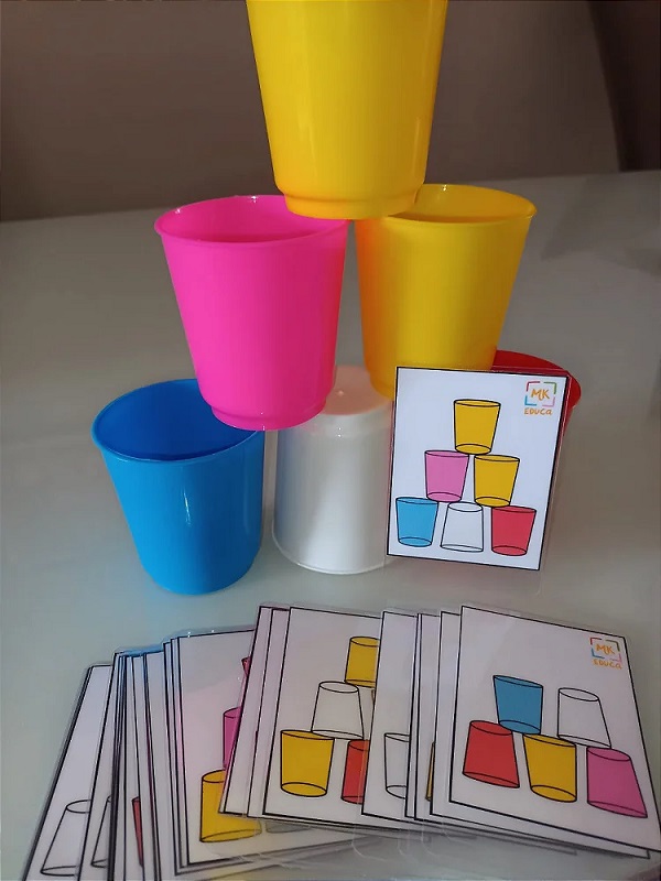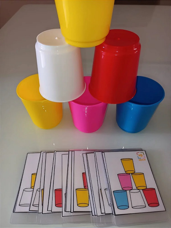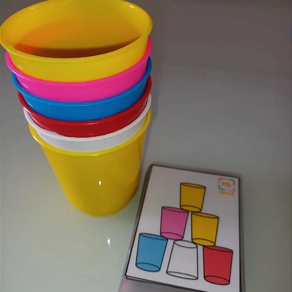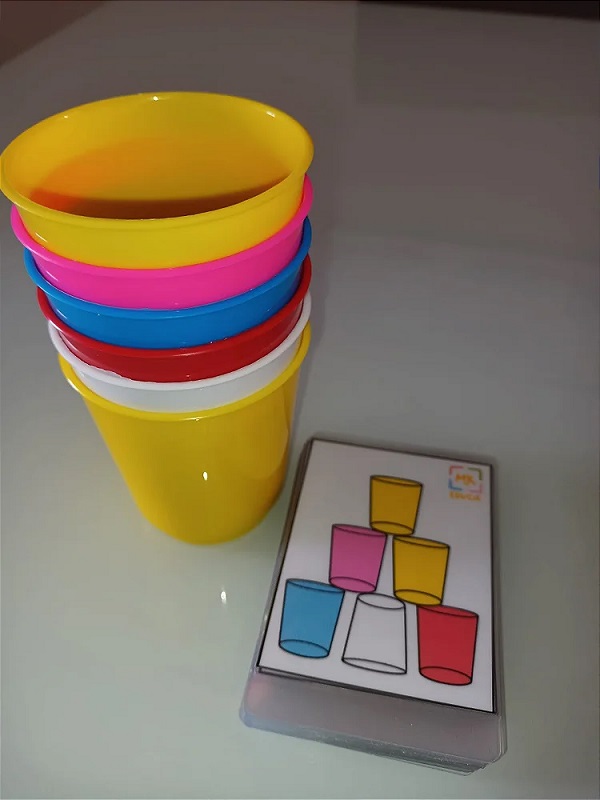 O jogo pedagógico Empilhando os Copos é composto por 24 cartas e 6 copos coloridos.