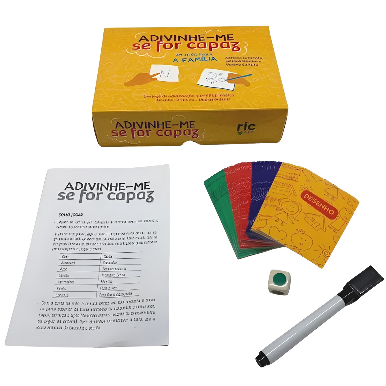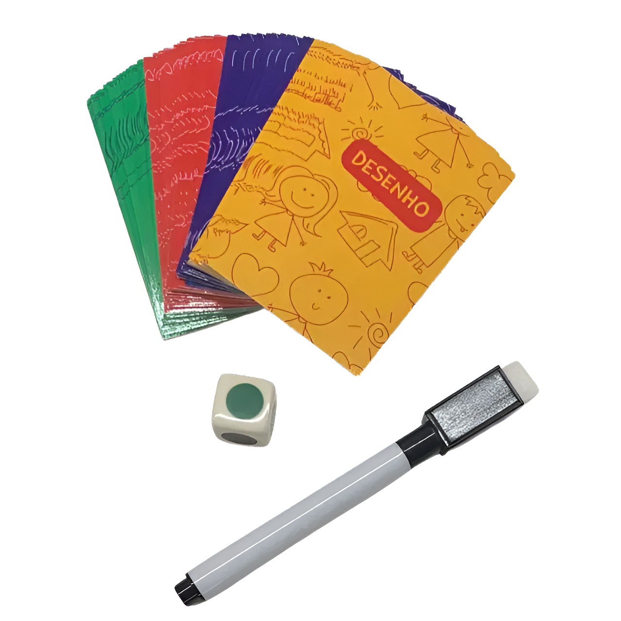 Contém: 80 cartas, 2 lousas, 1 dado e 1 caneta.