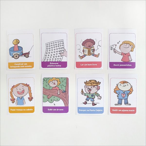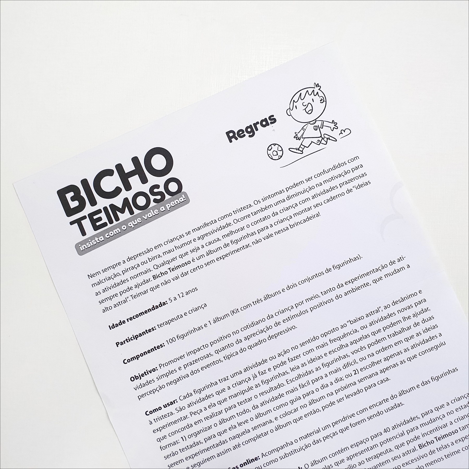 Álbum de figurinhas para a criança montar seu caderno de “ideias alto astral” para melhorar seu contato com atividades prazerosas, que vão na contramão do quadro depressivo. Também pode ser usado, alternativamente, para desafiar as crianças que fazem uso excessivo de telas a experimentarem atividade bacanas do mundo real. Teimar que não gosta ou não vai dar certo, sem nem experimentar, não vale nessa brincadeira! Caixa com 3 álbuns e 2 conjuntos de 100 figurinhas.