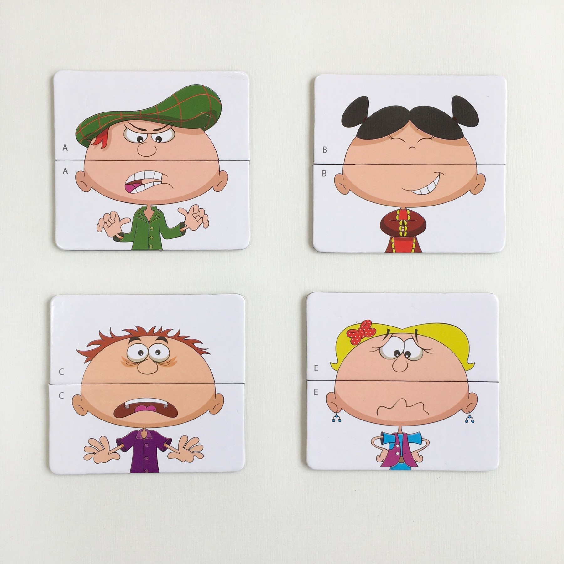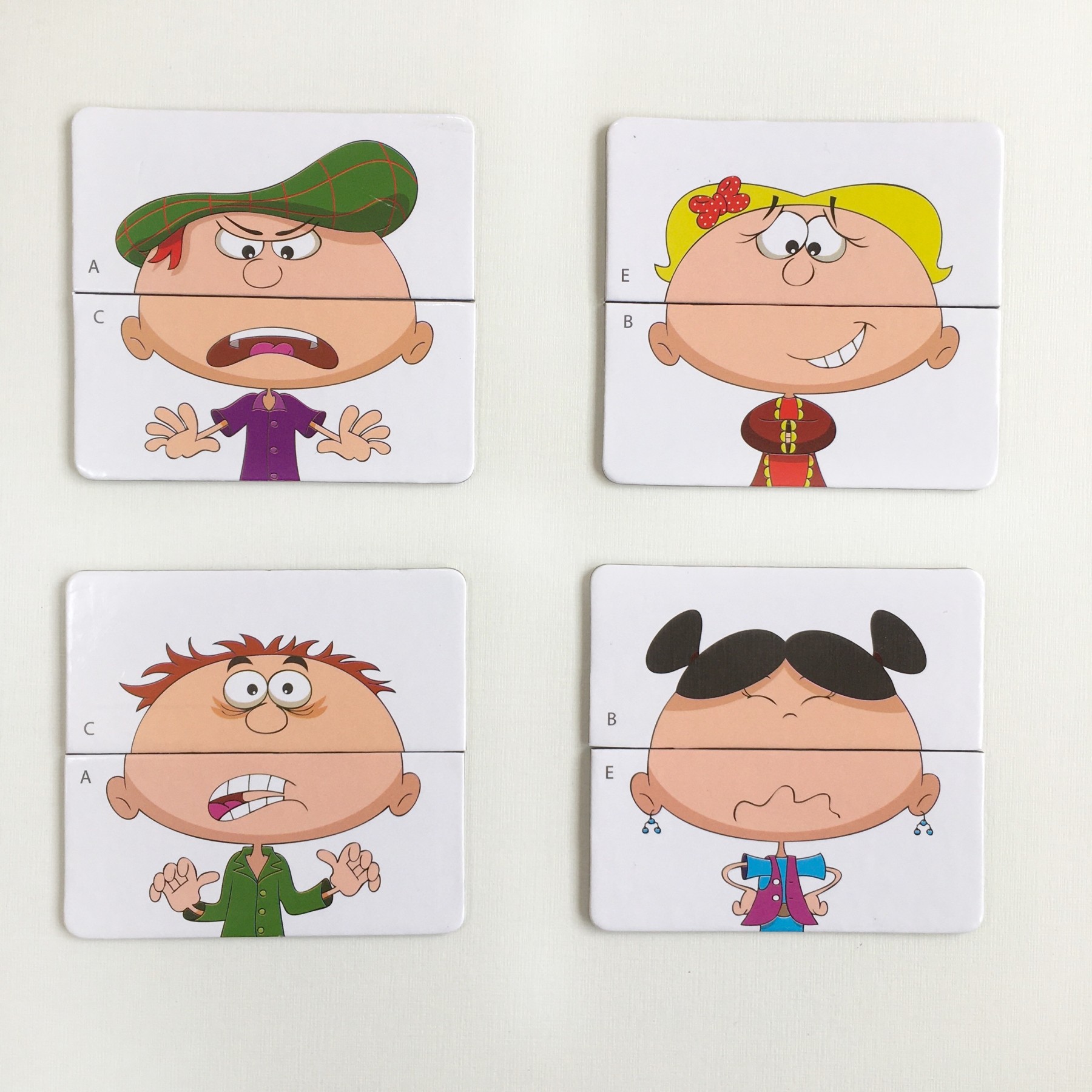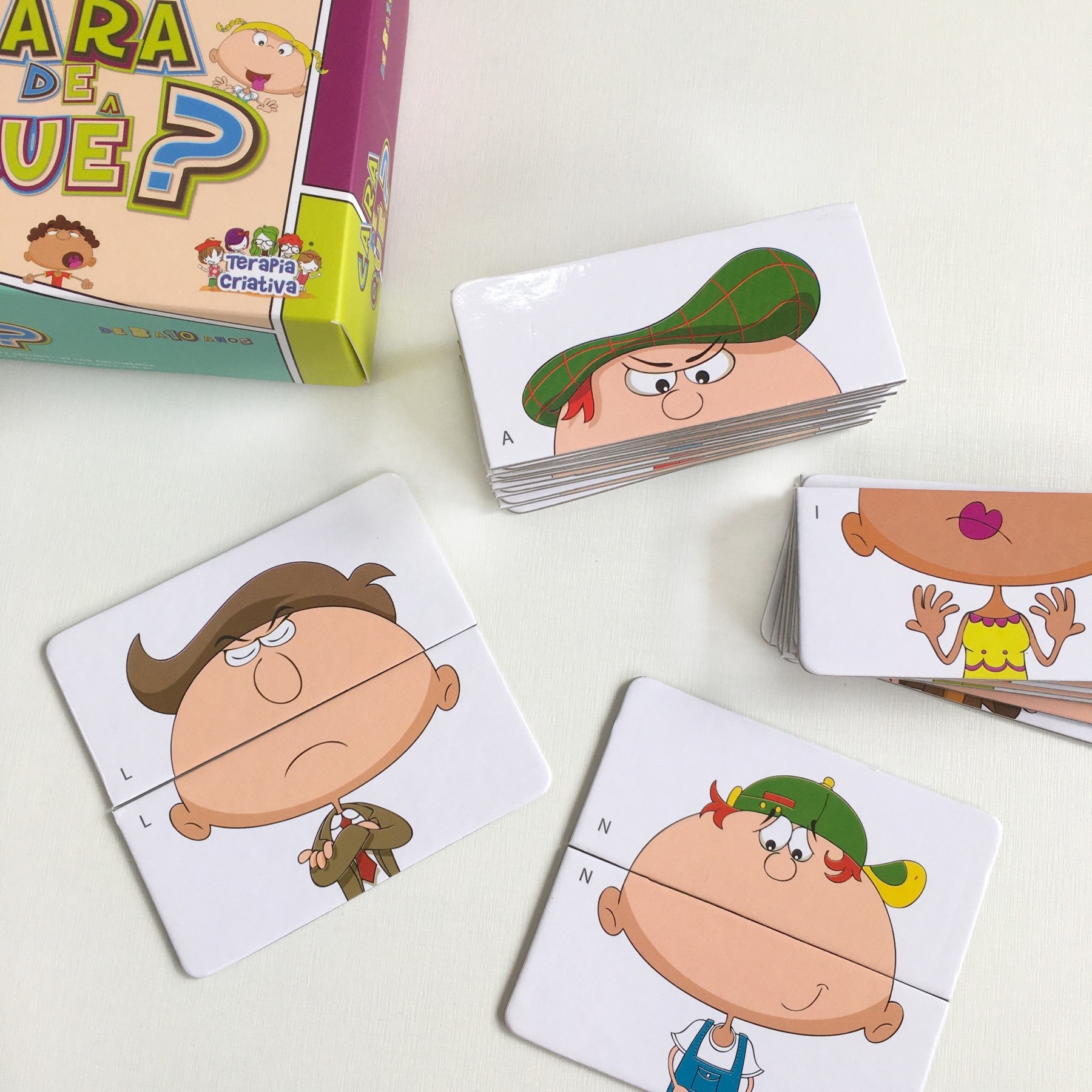 Cara de Quê? De quem aprontou e está com medo do castigo? De quem acabou de receber uma notícia boa? Cara de quê? é um material lúdico para ensino do reconhecimento de emoções e sentimentos pelas crianças a partir de expressões faciais. Os cartões com as carinhas se dividem ao meio e podem ser trocados, formando novas expressões. Assim, de forma divertida, pode-se trabalhar essa habilidade tão importante para a aprendizagem da empatia.