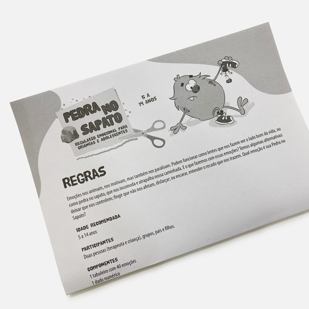 Emoções podem ser lentes que nos fazem ver o lado bom da vida, ou pedras no sapato, que nos incomodam e atrapalham nossa caminhada. Pedra no Sapato é um jogo terapêutico para o trabalho com a expressão e a regulação emocional com crianças e adolescentes. A brincadeira proposta ajuda a entender como seu cliente tem lidado com as emoções: deixando-se controlar por elas? Disfarçando e fingindo que não o afeta? ou encarando, entendendo o recado que trazem e empregar essas informações para uma expressão emocional assertiva e adaptativa? Qual emoção é sua Pedra no Sapato?