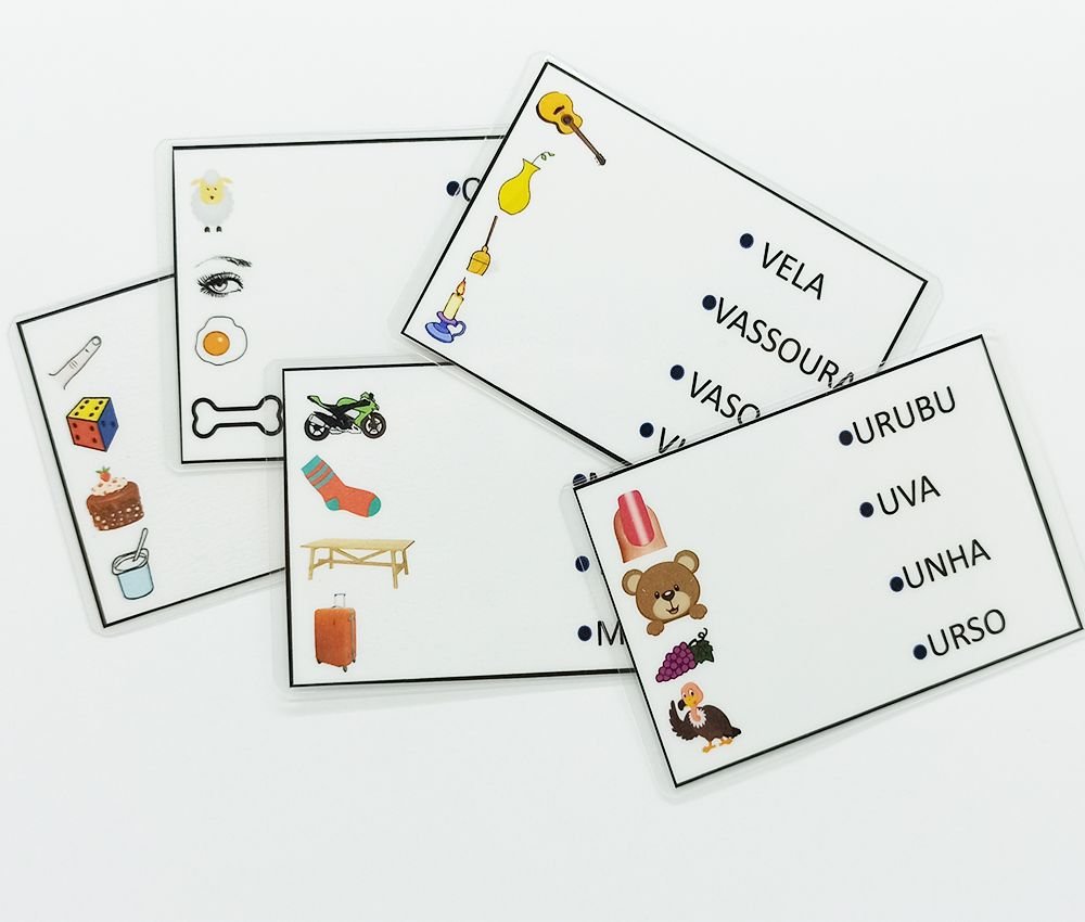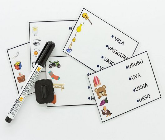 São 22 cartas com 4 escritos e 4 desenhos em cada carta para a criança treinar a leitura correta e ligar o nome a imagem. Acompanha caneta marcadora e mini apagador.