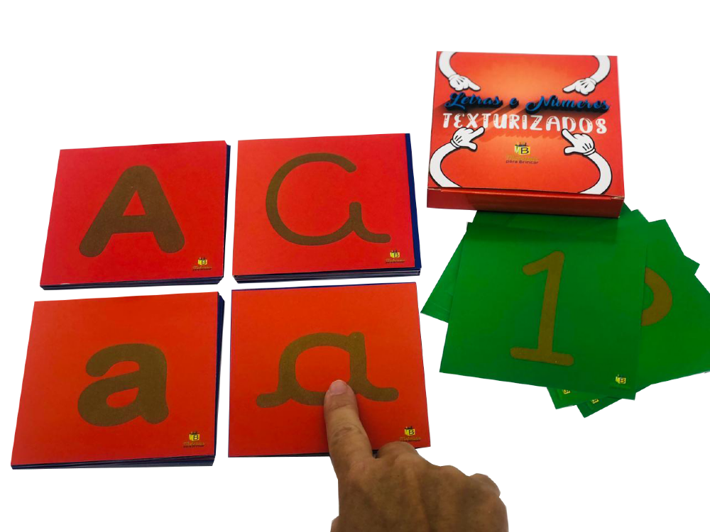 Contém uma caixa com 62 cartas do alfabeto texturizadas em letras imprensa e cursiva (maiusculas e minusculas) e números de 0 a 9.