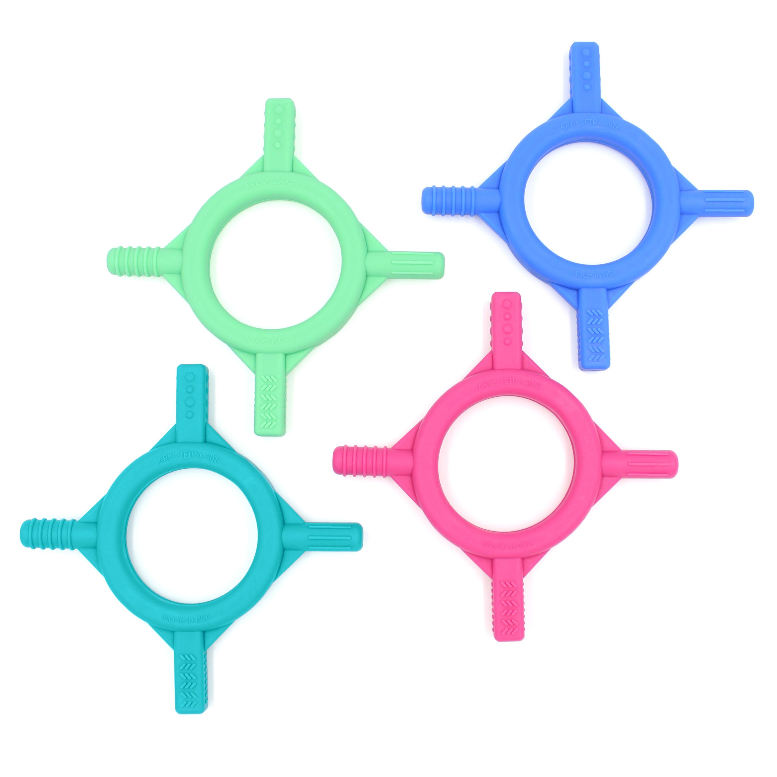 O Baby Tetra Bite ™ da ARK foi projetado para acalmar e acalmar bebês que estão nos estágios iniciais de desenvolvimento. Com aproximadamente 5 meses de idade, os bebês começam a usar a boca e mastigação para fortalecer os músculos e exercitar os lábios, língua e mandíbula. Essa exploração oral os prepara para comer alimentos sólidos e, mais tarde, para fazer os sons da fala. O Baby Tetra Bite ™ fornece uma opção segura para os bebês desenvolverem essas habilidades.