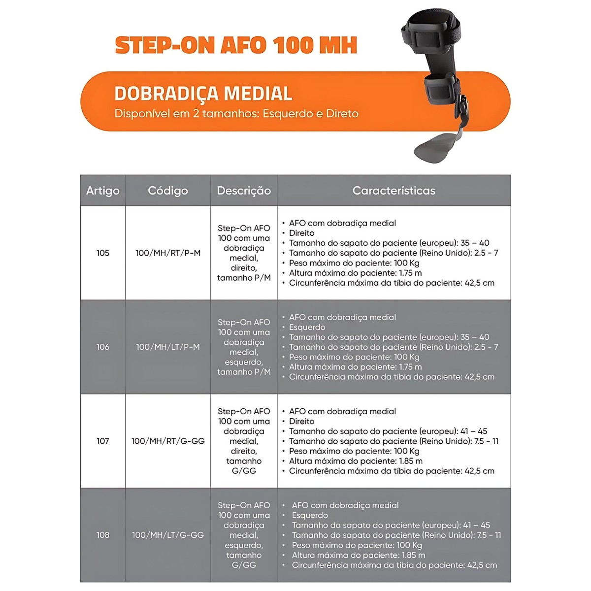 Órtese Dinâmica Ativa AFO 100 Step-on Medial – Síndrome do Pé Caído, Pé Equino
