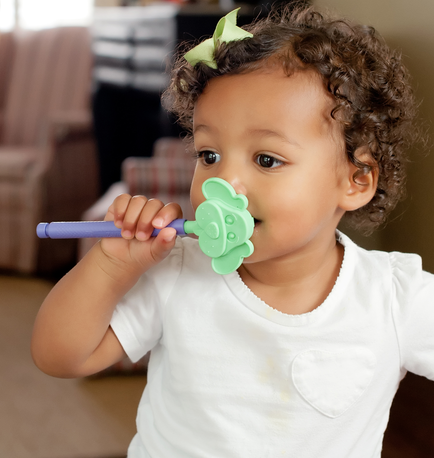 Use as orelhas texturizadas como colheres para diminuir a aversão da textura, ou use os blocos de mordida na parte de trás para praticar a classificação e a estabilidade da mandíbula.