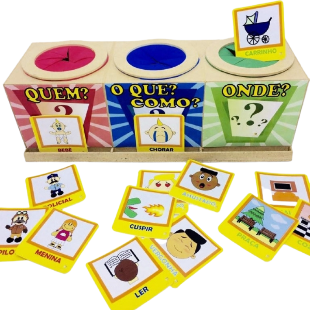 A caixa em madeira vem com 3 furos, revestida de EVA, 84 figuras divididas em  pessoas, ações, lugares e sentimentos. São 24 cartas de sujeito, 24 de ações, 12 cartas de sentimentos, 24 cartas de lugares.