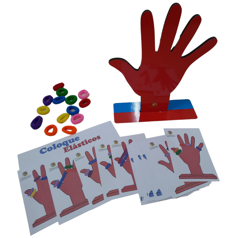 Contém: Uma mão feita em madeira com 2 cores diferentes conforme o lado, elásticos coloridos e cartas modelo.