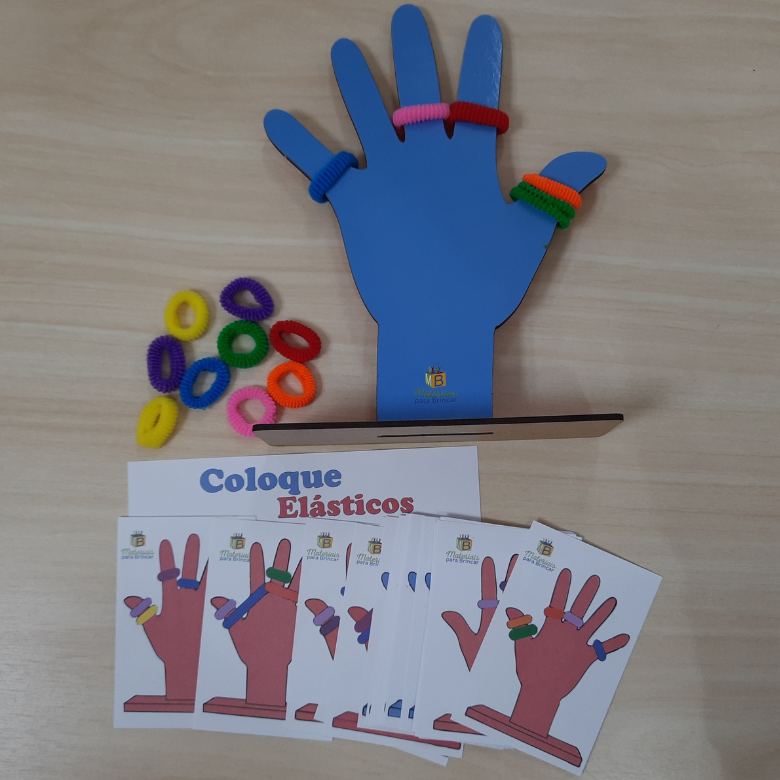 Sugestão de uso: Coloque os elásticos na mão de madeira e/ou da criança, conforme as cartas modelo. Trabalhe com a mão direita e esquerda, virando a mão de madeira do lado azul ou vermelho.