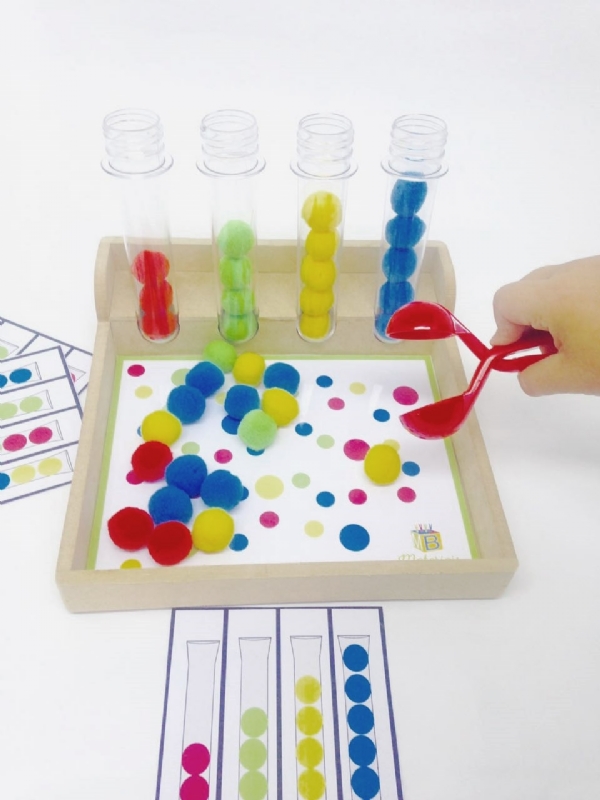Vem caixa de madeira com 4 tubos de ensaio, pompons coloridos, pinça bola e 6 fichas modelo.