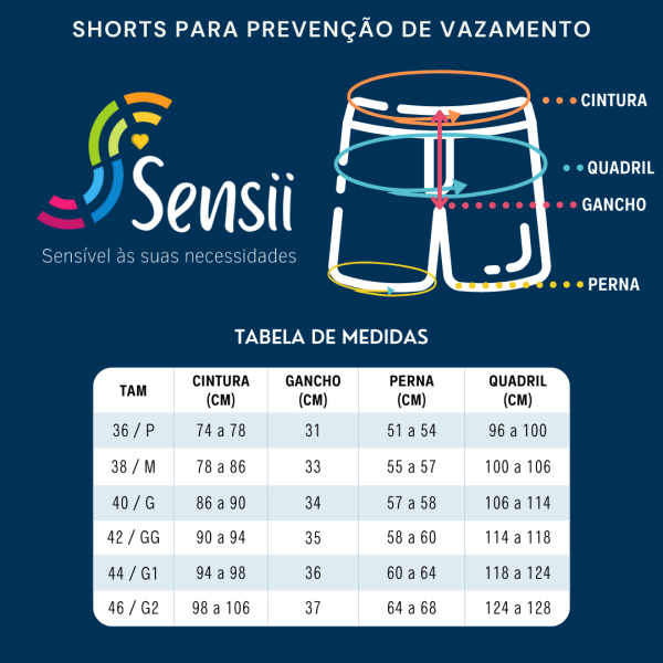 Projetado para idosos, deficientes, gravidez e pós-parto, o short antivazamento da marca Sensii, protege contra vazamentos com conforto. Ou seja, se você está procurando algo que adicione uma camada extra de proteção contra vazamentos, esse shorts é para você. Além disso, é confeccionado em tecido antirruído que proporciona o máximo conforto e segurança.