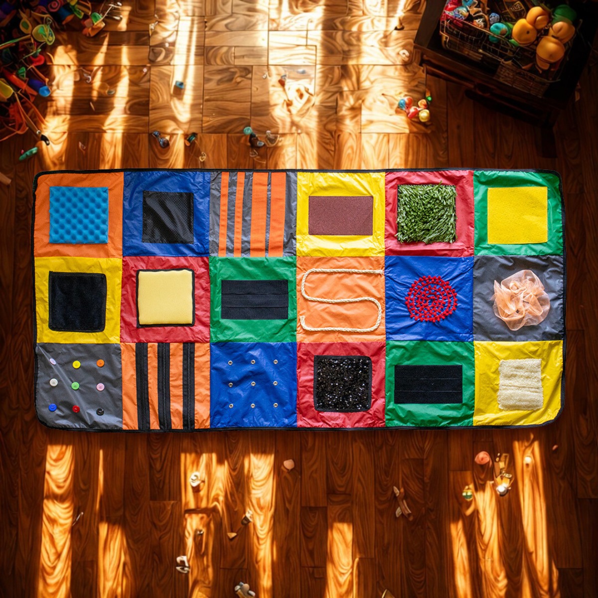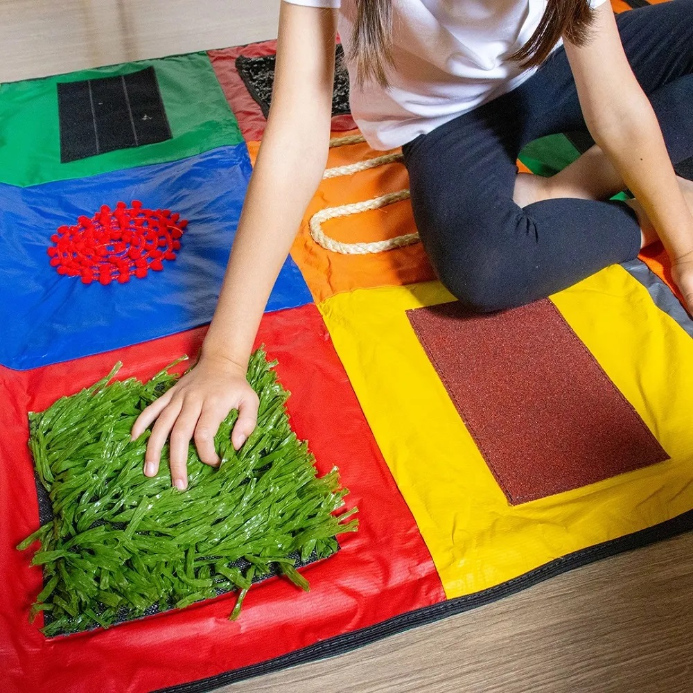 Tapete Sensorial Gigante, Recurso sensorial, estímulo sensorial, desenvolvimento sensorial, tapete texturizado, texturas, tato, visão, coordenação motora, concentração, socialização, comunicação, crianças, casa, escola, clínica, reabilitação.