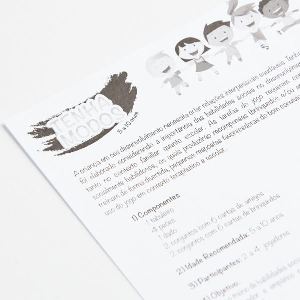 “Tenha Modos” foi elaborado considerando a importância das habilidades sociais no desenvolvimento infantil, tanto no contexto familiar quanto escolar. As tarefas do jogo proporcionam o treino de habilidades sociais em crianças, principalmente comportamento educado, assertivo, colaborador e empático nas relações verticais (com pais, avós, professores) e horizontais (com pares). O cumprimento das tarefas produzem recompensas (brinquedos e/ou amigos). Indica-se o uso do jogo em contexto terapêutico e escolar.