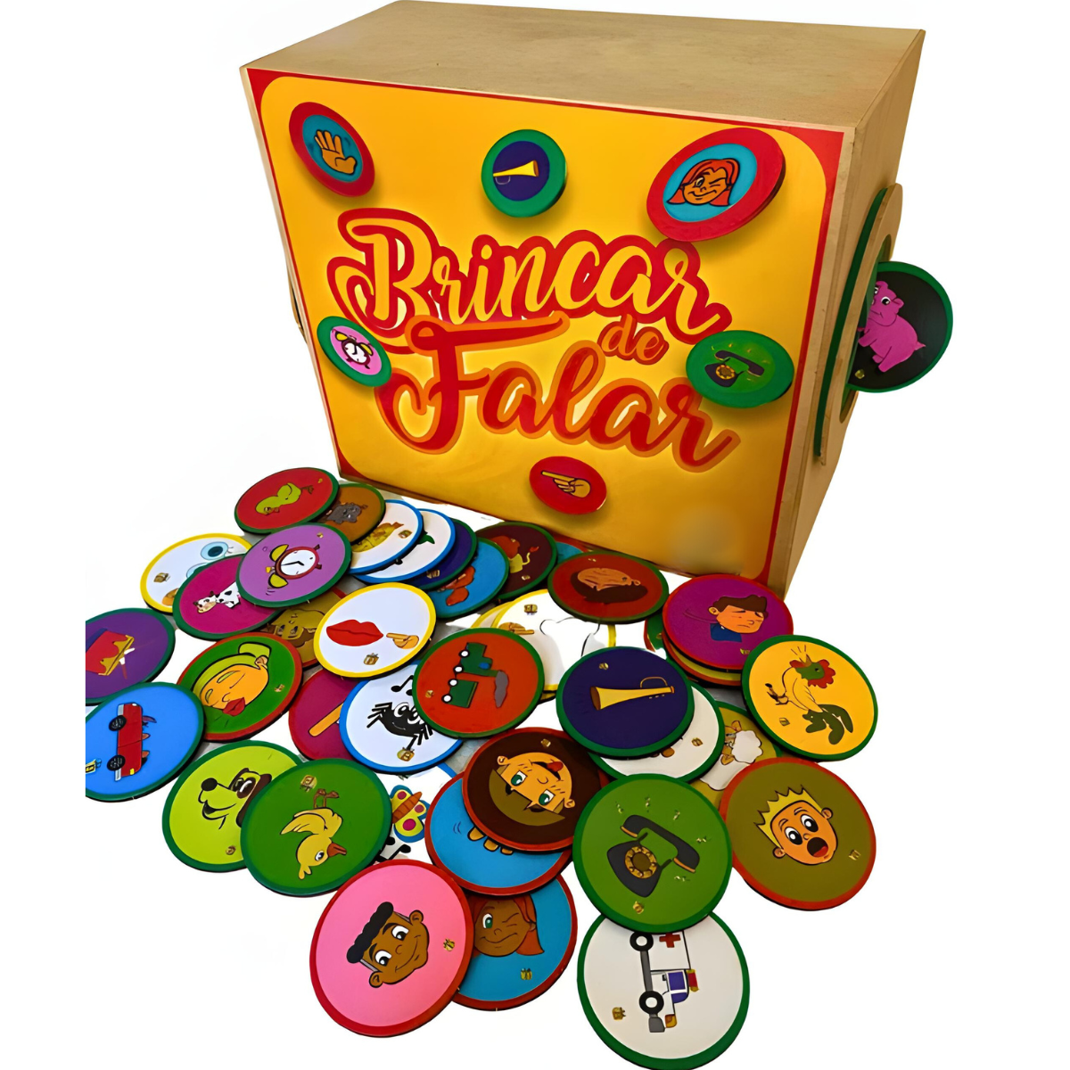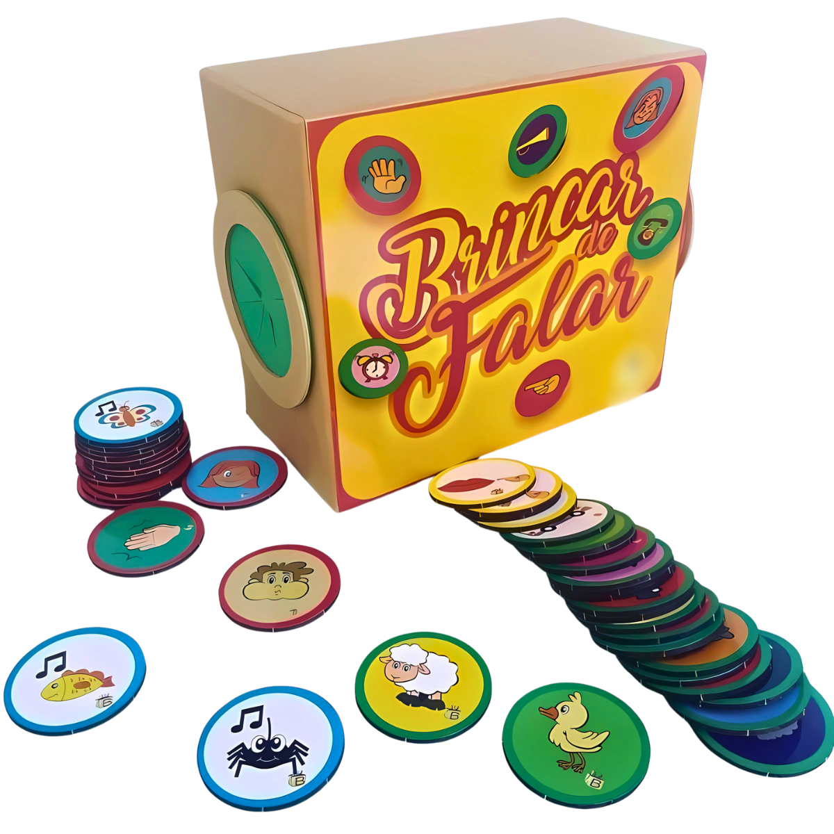 Contém 1 caixa com 2 furos nas laterais 42 fichas divididas em nomeação de sons, imitação de gestos, apontar partes do rosto e cantar músicas.