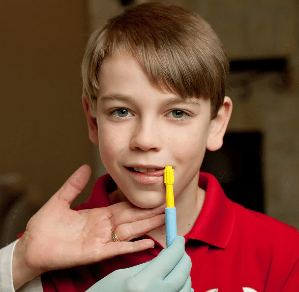 A ponta de exploração da ARK é o acessório mais versátil do Z-Vibe®, pois sua forma retangular apresenta três texturas diferentes: irregular, estriada e lisa. Use-o para permitir informações sensoriais variadas às gengivas, palato, bochechas, língua e lábios. Além disso, também pode ser usado para fornecer estímulos táteis direcionadas durante a terapia motora oral.